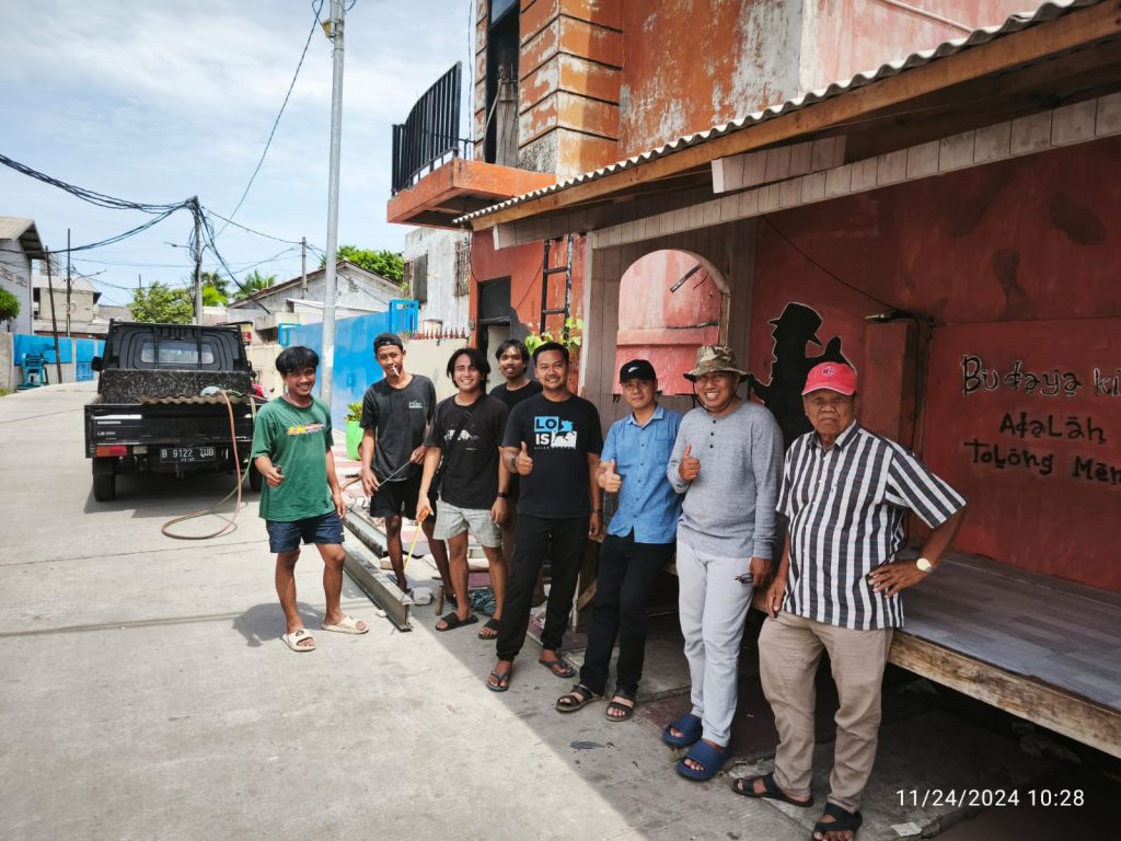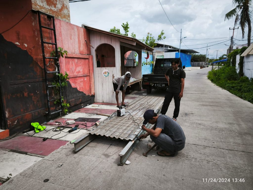 Pekerjaan dilakukan mulai pagi hari dengan melas rangka jembatan yang dibuat dari Besi yang kokoh, semua pekerjaan ini dilakukan oleh warga2 Hebat RT 12, di monitor juga oleh Ketua RW. 01 Bapak Firdaus,